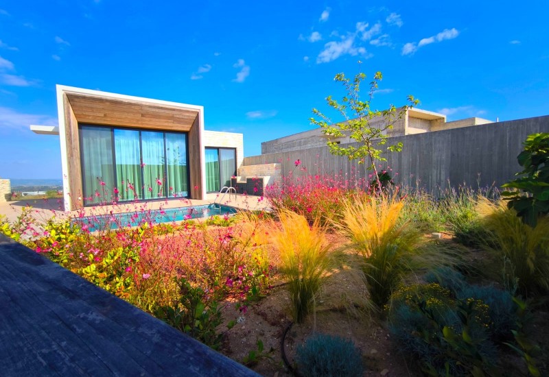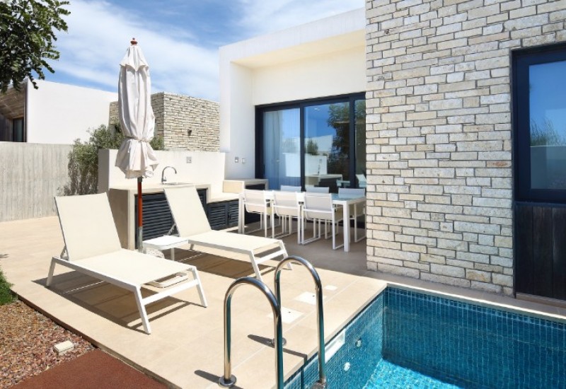 Unique villa, featuring a large garden and a sparkling swimming pool with a lovely outdoor sitting area.